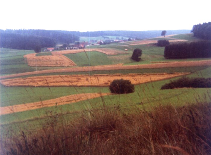 | Ansicht aus Norden, man sieht das schöne Schwarzachtal, rechts geht es zum "Säuberg, der hat seinen Namen von den vielen Wildschweinen, die es hier gab, auch befanden sich noch Reste einer Wildschweinfalle bis ca. 1964 im Wald, das war ein großes Rundell mit dicken Stämmen die senkrecht im Boden eingegraben waren, es gab einen Zugang den man dann runterfallen ließ sobald sich genügend Wildschwein die angelockt wurden, drinnen waren | |