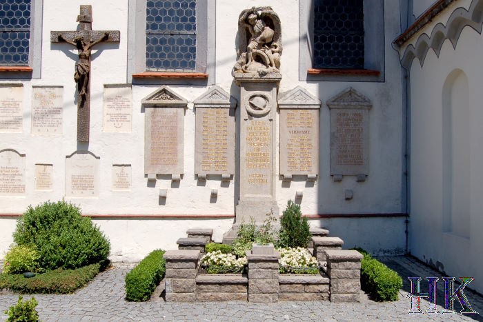 Denkmal und Grabsteine auf dem Friedhof bei der Pfarrkirche St. Margaretha |