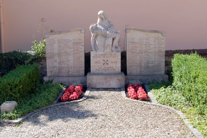 Denkmal und Grabsteine auf dem Friedhof bei der Pfarrkirche St. Stephan |
