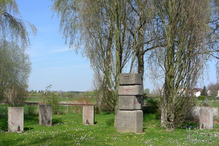Denkmal beim Gemeindefriedhof und Steinplatte in der Kirche |