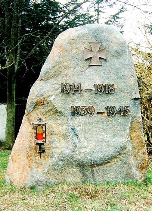 Vor der Kirche ein großer Findling mit einem großen Eisernen Kreuz, in der Kirche befindet sich eine Tafel, |