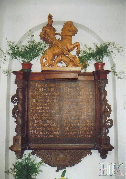 Inschrift: FÜR DIE HEIMAT GABEN IHR LEBEN Hölzerne Gedenktafel angefertigt von Bildhauer Konrad aus Reichholzried. Die Namen der Gefallenen und Vermißten sind auch auf dem Denkmal in Schlingen verzeichnet. |