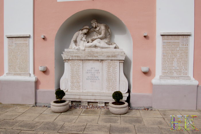 Gedächtniß-Tafel für jene Angehörigen der Pfarrei Beningen DEN 1914 - 1918 GEFALLENEN DER GEMEINDE BENNINGEN 1922 UNSEREN GEFALLENEN U. VERMISSTEN SÖHNEN 1939 - 1945 |