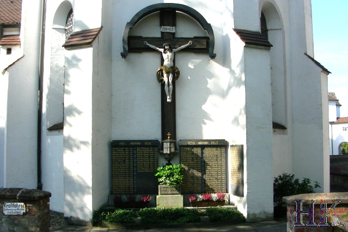 Kriegerdenkmal an der Pfarrkirche "St. Georg" und Grabsteine auf dem Friedhof |