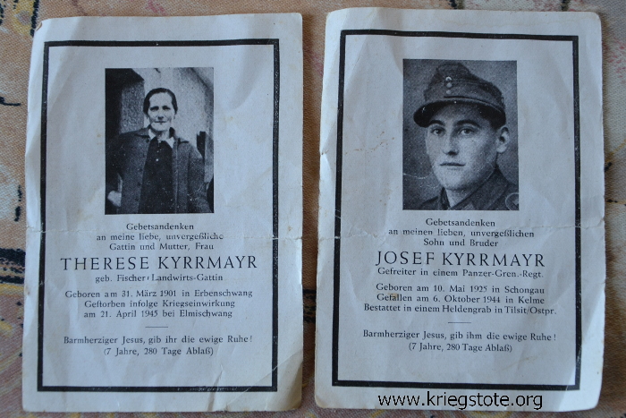 Sterbebilder von Frau Therese Kyrrmayr und Ihrem Sohn Josef Kyrrmayr der 1944 gefallen ist |