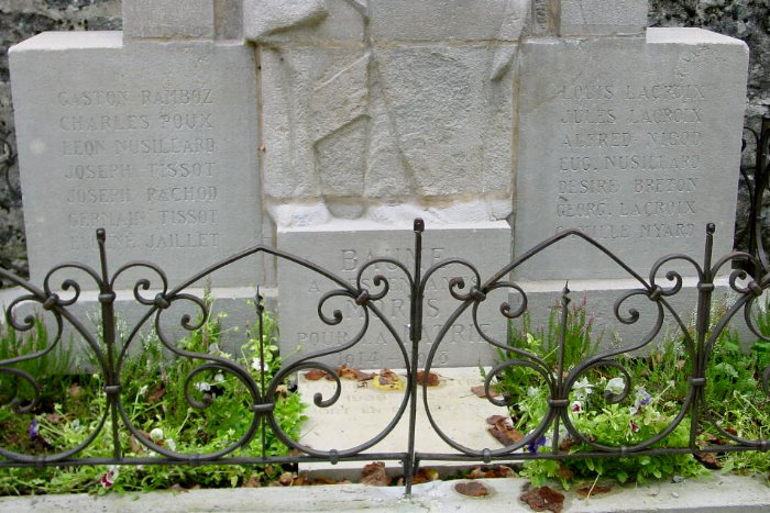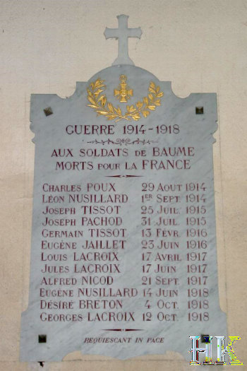 Gedenktafeln und Grabsteine in Baume-les-Messieurs auf denen Opfer verzeichnet sind