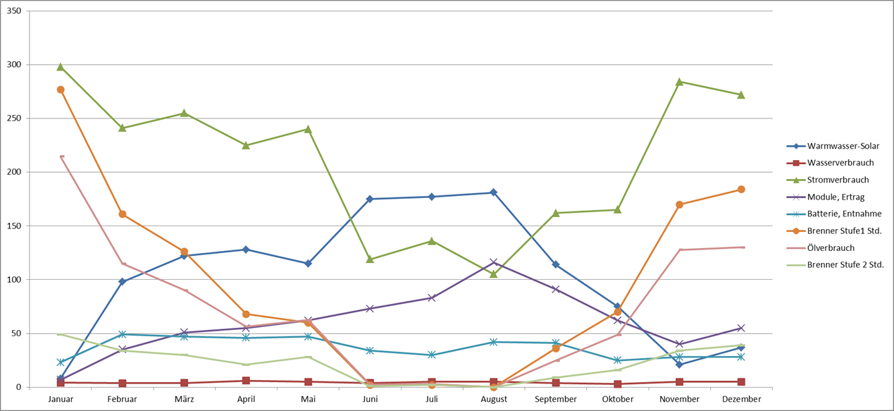 | Stromverbrauch | 298 | 241 | 255 | 225 | 240 | 119 | 136 | 105 | 162 | 165 | 284 | 272 | |
