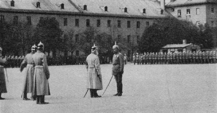 Reserve-Infanterie-Regiment 16 List am 08.10.1914 aufgestellt zur Vereidigung, Oberst List erstattet im Kasernenhof des Leibregiments dem König Meldung |