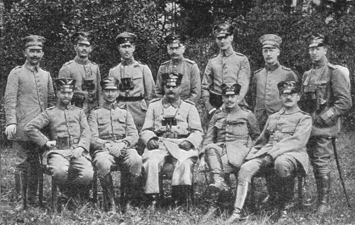 Eine Aufnahme vor dem Tod von Ypern Sitzend: Regiments-Adjutant Schnitzlein (verw.), Hauptmann Graf von Bassenheim, Oberst List +, Oberleutnant Hagen +, Oberleutnant Peukert +, Stehend: Arzt Dr. Bühner, Oberleutnant Beuschel +, Adjutant Herterich +, Hauptmann von Lüneschloß (verw.), Adjutant Piloty, Arzt Dr. Fischbach +, Leutnant Graf + |