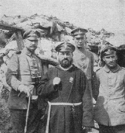 Der beliebte Divisionspfarrer Kapuzienerpater Norbert Stumpf, die "große Sündenabwehrkanone" und der feldgeistliche Dr. Westermayer im Schützengraben mit Oberstleutnant Spatny und Leutnant Seelbach. |