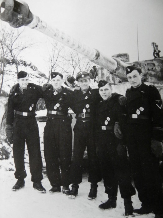 mit seiner Besatzung im Januar 1944 v.l. Ladeschütze Werner Irrgang, Richtschütze Bobby (Balthasar) Woll, Wittmann, Funker Sepp Rößner, Fahrer Eugen Schmidt vor dem Tiger S 04 mit 88 aufgemalten Abschußringen |